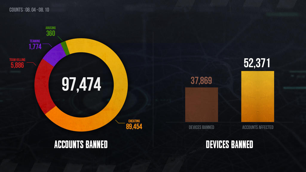 8月4日 至 8月10日 期间,共计对97,474个违规账号进行了封禁,其中89,454个账号因使用外挂被永久封禁。